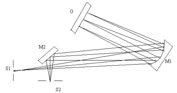 平麵光柵的工作原理是光源發出的光均勻地照亮在入射狹縫S1上,S1位於(yu) 離軸拋物鏡的焦麵上。光經過M1平行照射到光柵上,並經過光柵的衍射回到M1,經M1反射的光經過M2會(hui) 聚到S2出射狹縫上。由於(yu) 光柵的衍射作用,從(cong) 出射狹縫出來的光線為(wei) 單色光。當光柵轉動時,從(cong) 出射狹縫裏出來的光由短波到長波依次出現。這種光學係統稱為(wei) 李特洛式光學係統,見下圖所示。