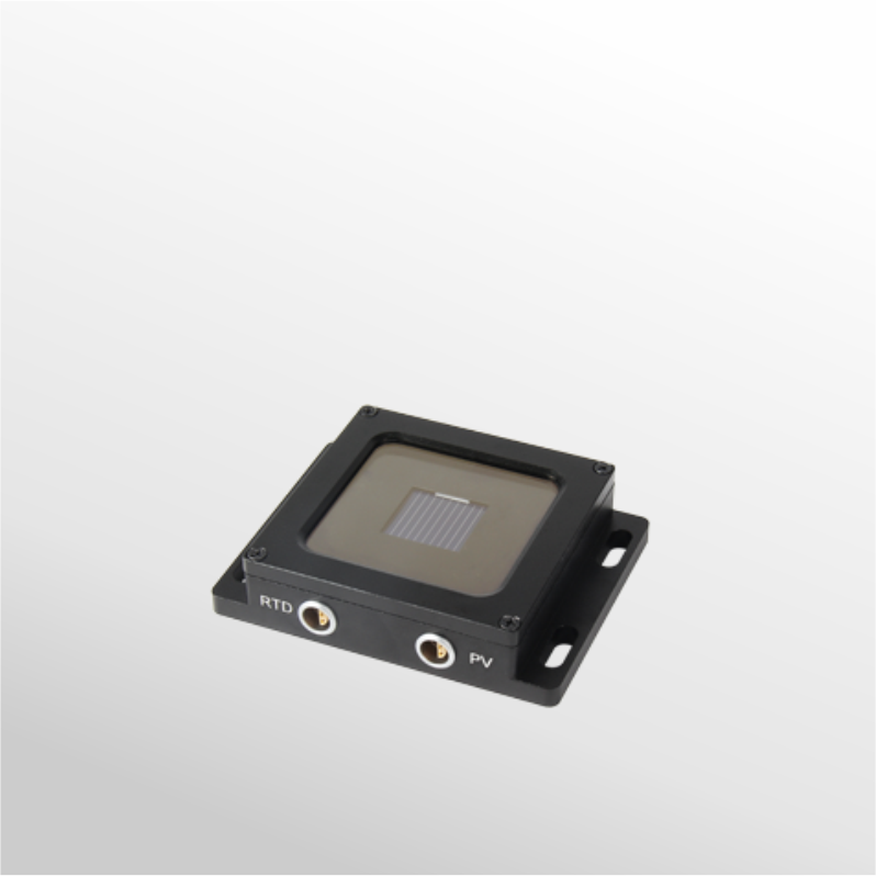 標準太陽電池為(wei) 2cm*2cm 的單晶矽或多晶矽(可依據用戶需要定製)光伏電池,經過老化、篩選,選擇穩定性好、表麵均勻的進行全密封式封裝。太陽電池置於(yu) 方形鋁基座的中心,並配有一個(ge) 抗輻照玻璃保護窗口,窗口的封裝采用透明性好,折射係數相近的光敏膠。太陽電池的下麵裝有Pt100鉑電阻溫度傳(chuan) 感器,在封裝前已進行標定。太陽電池和測溫傳(chuan) 感器均采用四端輸出的Kelvin連接接線方式。