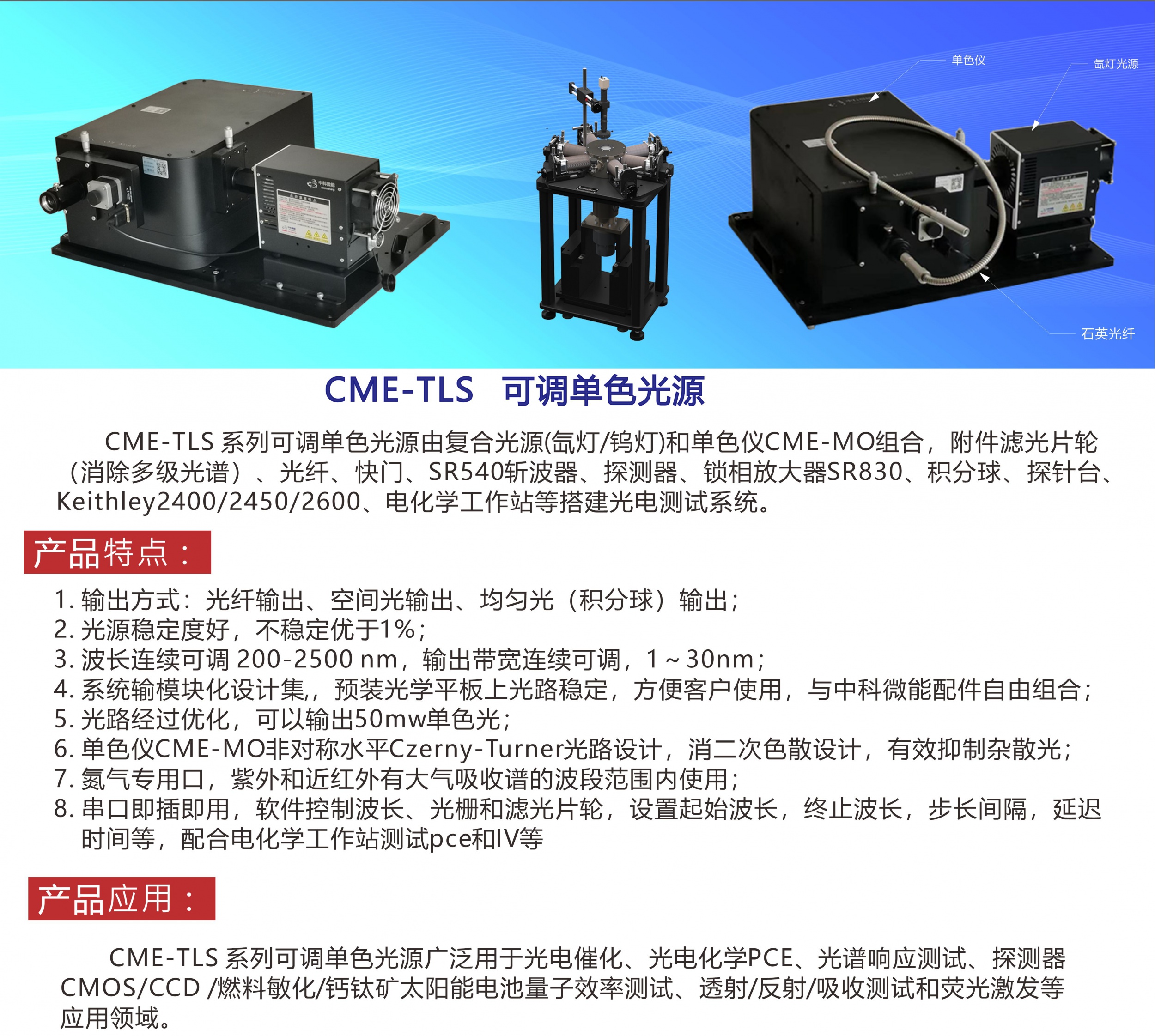 CME-TLS 係列可調單色光源,主要由複合光源和單色儀(yi) 組合,配合濾光片輪(消除多級光譜)、光纖、快門、SR540斬波器、探測器、鎖相放大器SR830、積分球、探針台、Keithley2400/2450/2600、電化學工作站等附件搭建光電測試係統。廣泛用於(yu) 光電催化、光電化學PCE、光譜響應測試、探測器CMOS/CCD /燃料敏化/鈣鈦礦太陽能電池量子效率測試、透射/反射/吸收測試、熒光激發等應用領域。