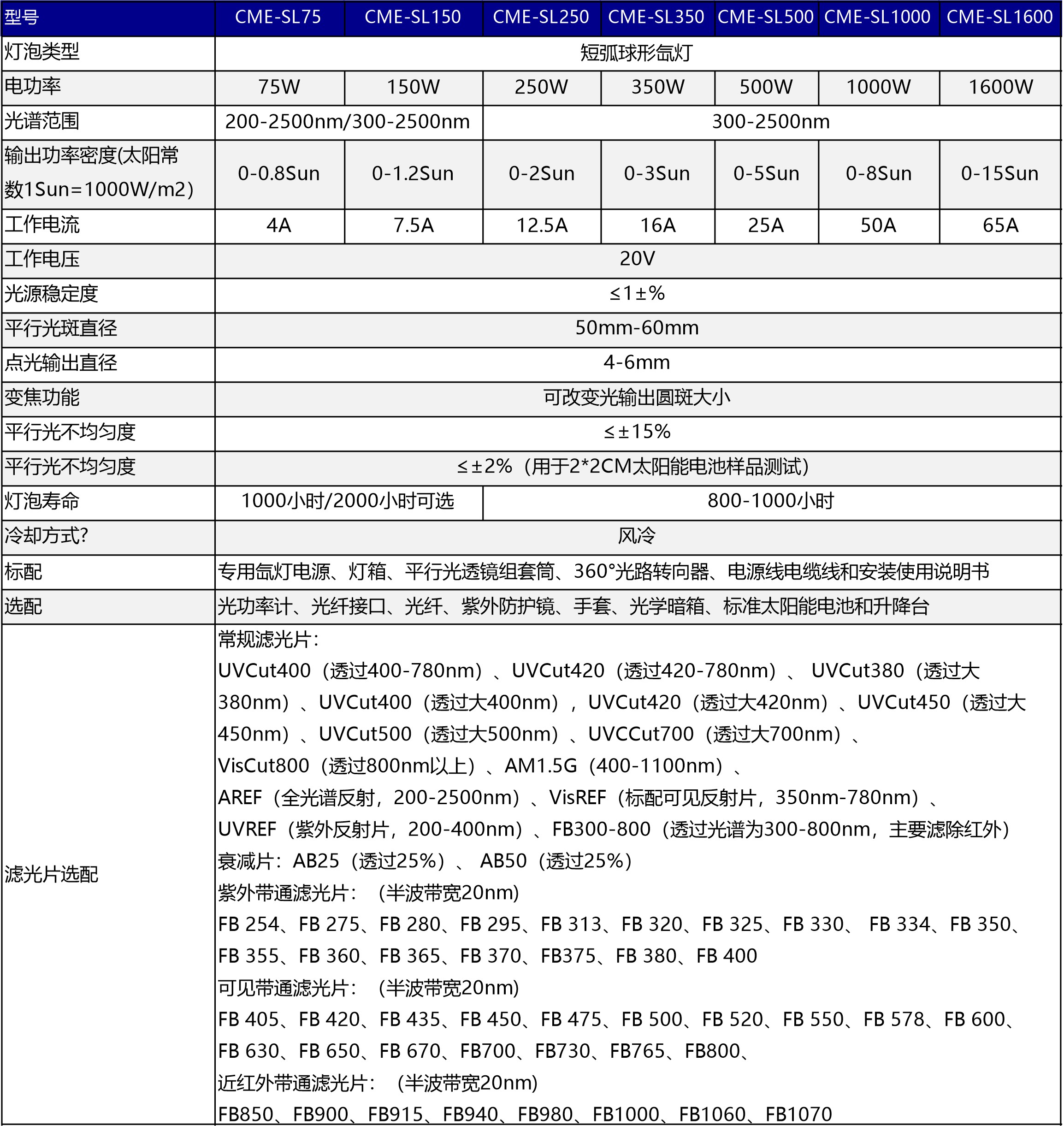 CME-SL係列氙燈光源內(nei) 部安裝高壓短弧球形氙燈,中科微能生產(chan) 75W-1600W氙燈光源光譜覆蓋範圍從(cong) UV-VIS-IR300-2500nm連續波長, 高穩定電源和高效散熱燈箱,延長燈的壽命。