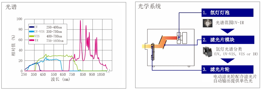 4. 電動濾光輪自動輸出:AM1.5G標準光譜、紫外區、可見區、近紅外區及單色光;