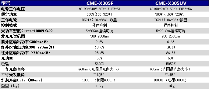 光催化氙燈光源CME-X305升級款(高光功率)采用美國進口燈泡、改進了散熱結構和電源模塊提高了燈泡使用壽命,光譜範圍UV-VIS-IR連續波長(200-2500nm和300-2500nm可選),模擬太陽光、可見光、紫外光、紅外光和單色光配合光功率計、濾光片、反應器、石英光纖、恒溫槽、升降台和科研試驗箱等滿足不同的實驗要求,CME-Xe305F側(ce) 重於(yu) 模擬太陽光,CME-Xe305UV在200nm-400nm內(nei) 有較強的紫外光,主要應用於(yu) 對紫外連續分布有較高要求的領域。